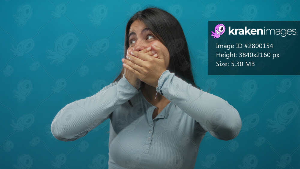 Woman covering mouth with hands in surprise against blue wall background, wearing a light shirt, young hispanic female expressing emotion in an isolated setting - Kraken Images