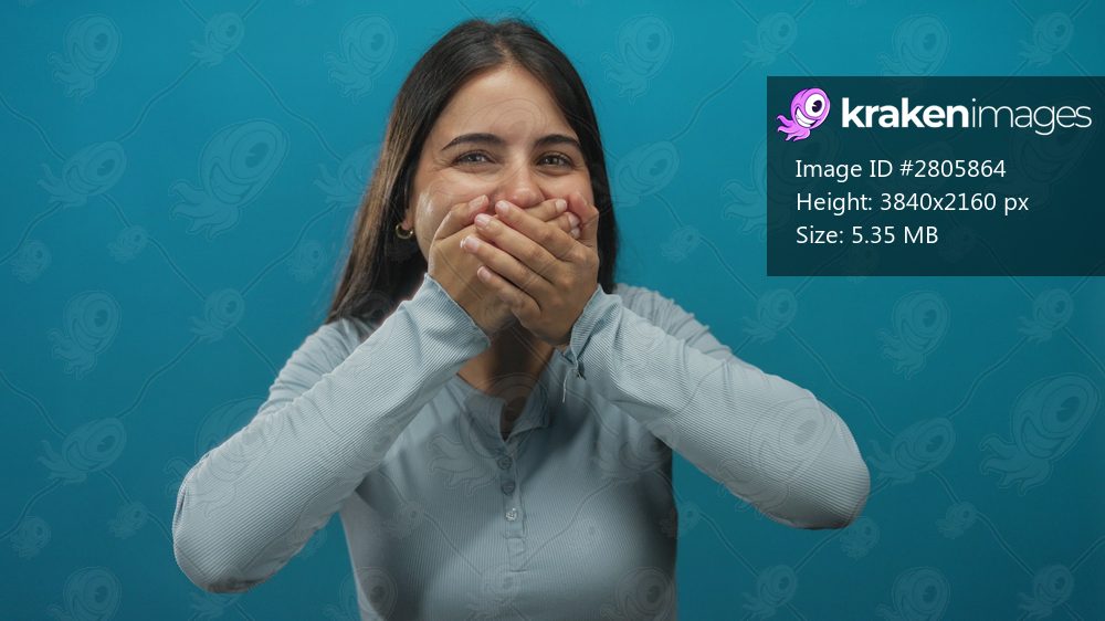 Woman covering mouth with hands in surprise against blue wall background, wearing a light shirt, young hispanic female expressing emotion in an isolated setting - Kraken Images