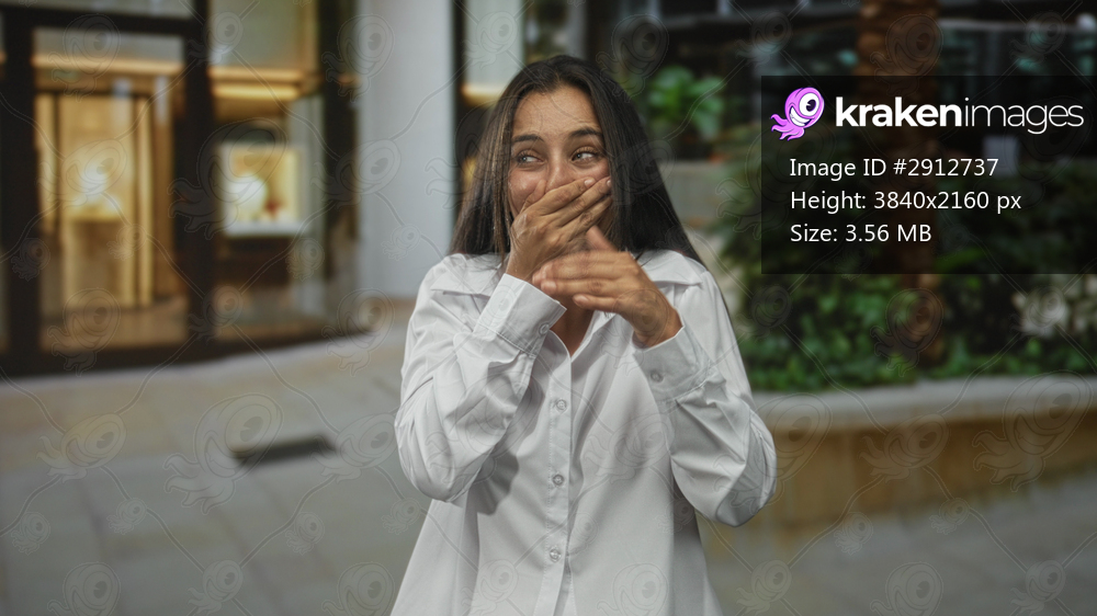 Woman covering mouth with hands on a city street outside shops and glass storefronts, palms over lips and smiling eyes visible; laughter.