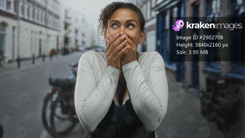 Woman covering mouth with hands on a cobbled street with parked motorcycle and row of buildings; surprise joy.