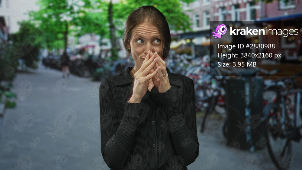 Woman covering mouth with hands on busy city street lined with bicycles and cafe terraces while glancing sideways; shyness curiosity intrigue.