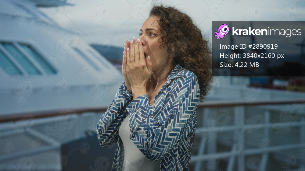 Woman covering mouth with hands on cruise ship deck near railing and ship superstructure; alarm concern.