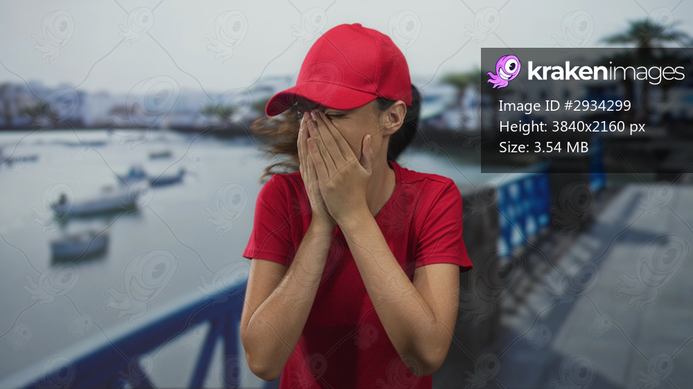 Woman covering mouth with hands on seaside street promenade in red cap and shirt, bare forearms visible; surprise reaction.