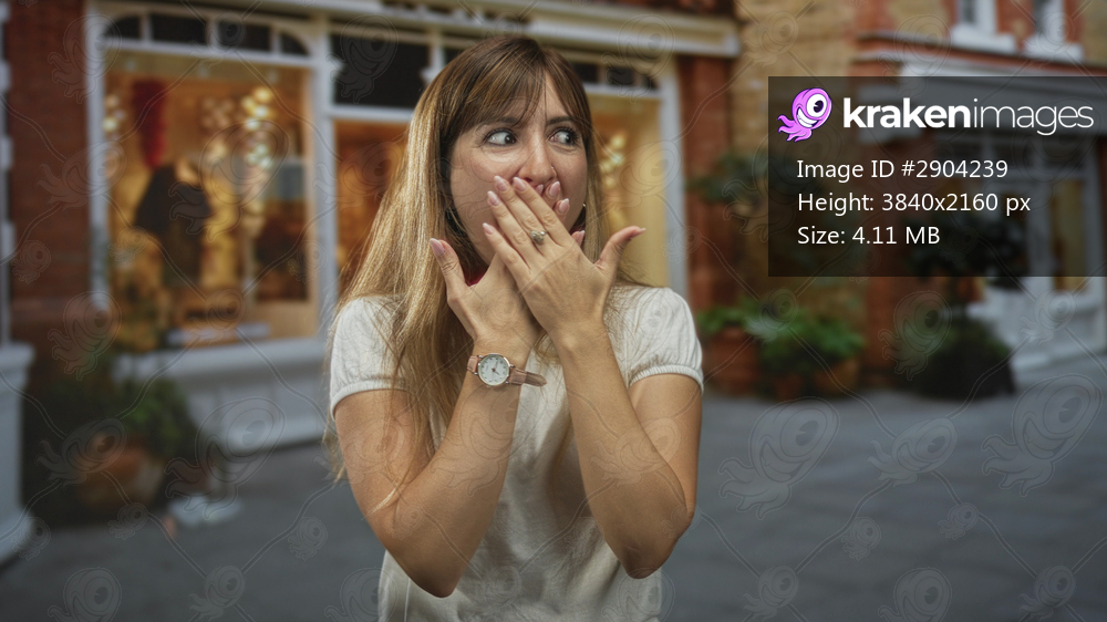 Woman covering mouth with hands on street outside shop window display, palms over lips and startled eyes; surprise curiosity.