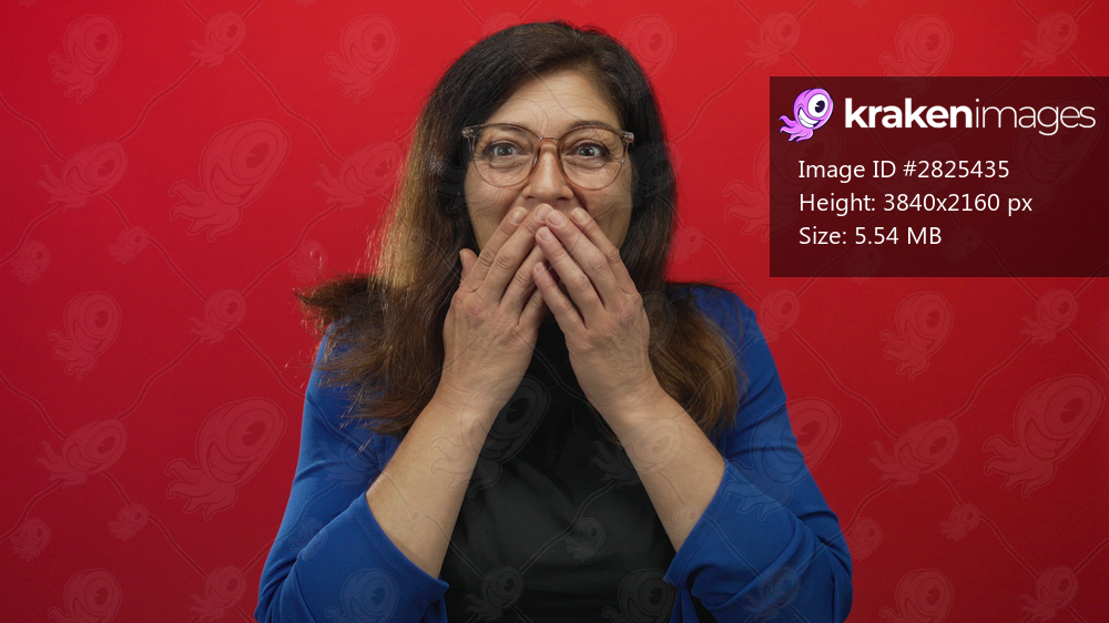 Woman covering mouth with hands and raising eyebrows in studio space against red wall with dark hair; surprise.