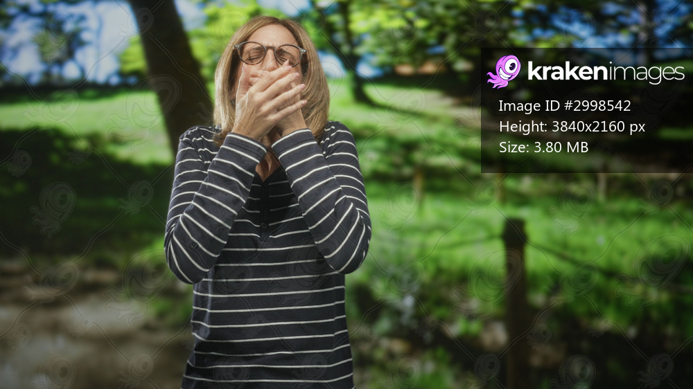 Woman covering mouth with hands while sneezing in forest wearing striped sweater and glasses; allergy discomfort.