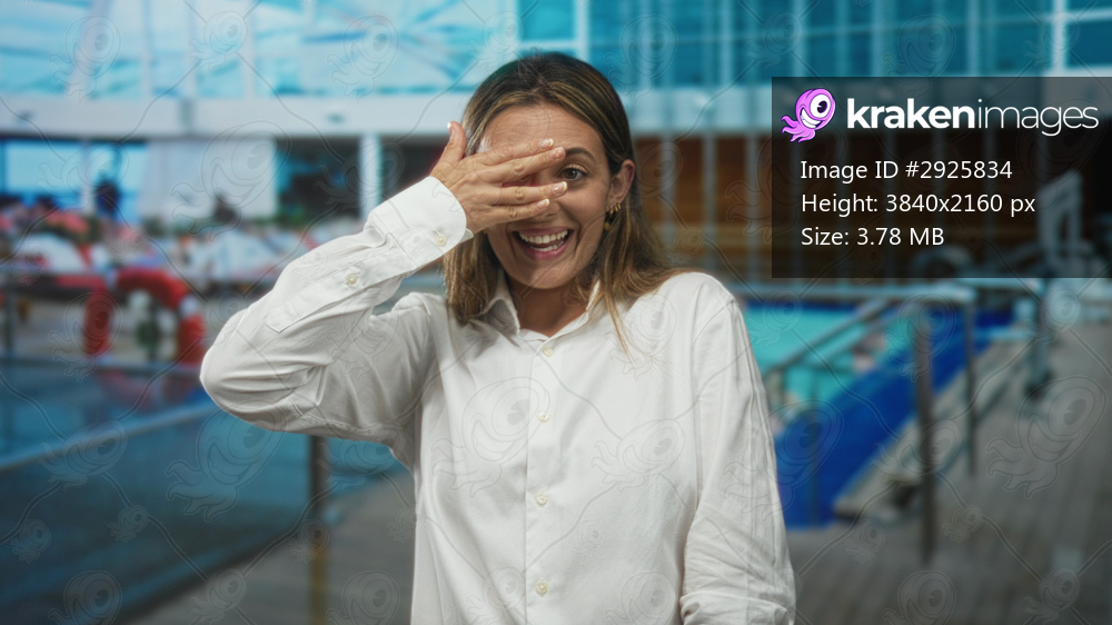 Woman covering one eye with hand and smiling at an indoor pool deck in a building, playful pose toward camera; joy.