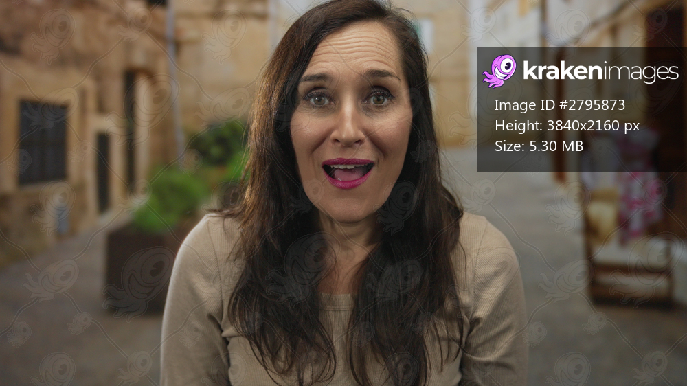Woman covers cheeks with hands against weathered stone walls in an oldtown cobblestone street; astonishment wonder joy excitement.