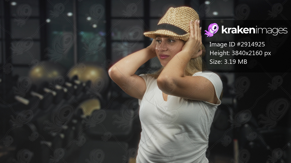 Woman covers ears and adjusts straw hat while standing in a gym building; discomfort travel hesitation.