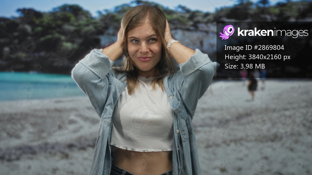 Woman covers ears with both hands on a sandy beach by the rocky coast, posing near shoreline cliffs; annoyance.
