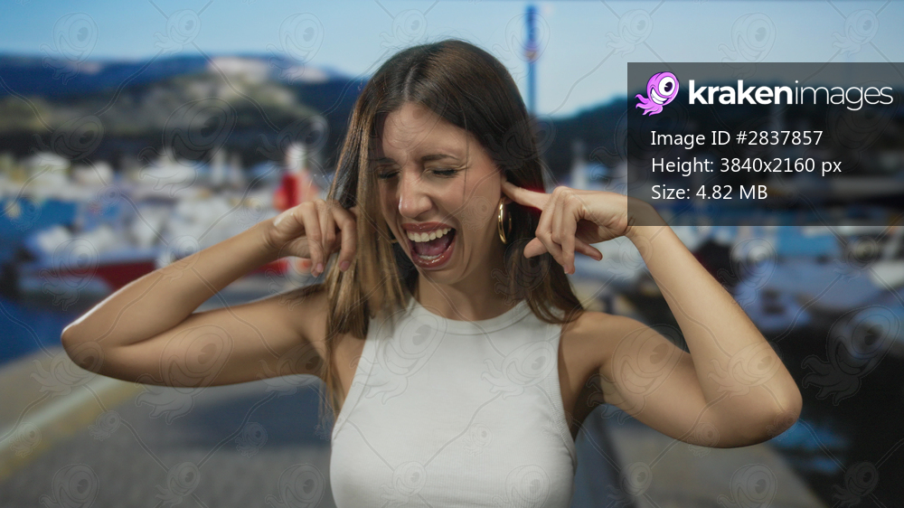Woman covers ears with fingers while grimacing at a sunny pier with moored leisure boats; annoyance.