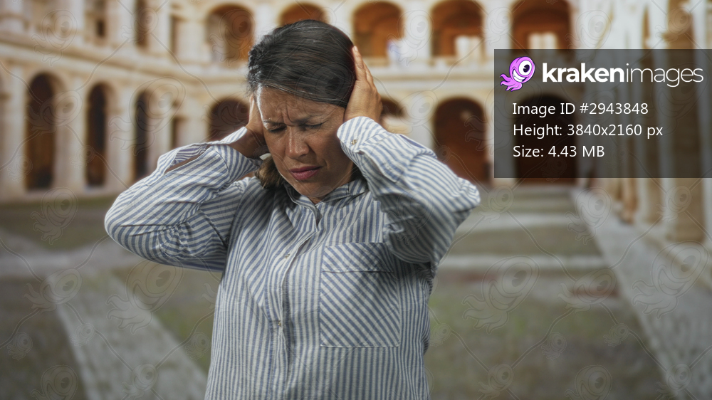 Woman covers ears with hands in a historic building courtyard, striped shirt and strained facial expression with closed eyes; discomfort.