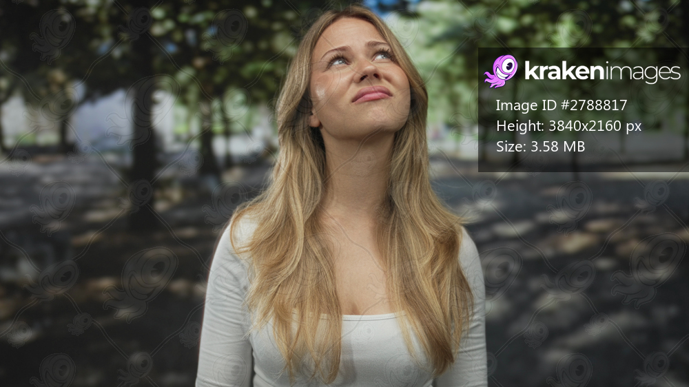 Woman covers ears with hands in park; pain frustration.
