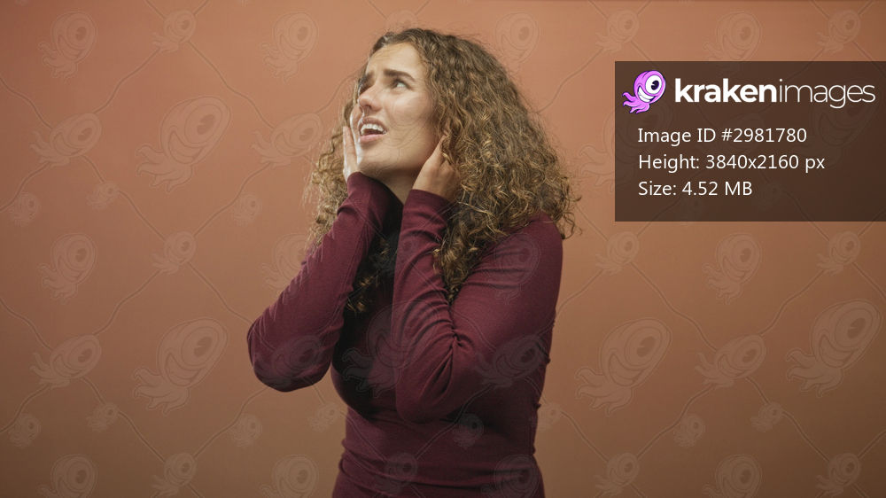 Woman covers ears with hands and looks upward in studio wearing maroon sweater, tense expression and closed posture; anxiety coping.