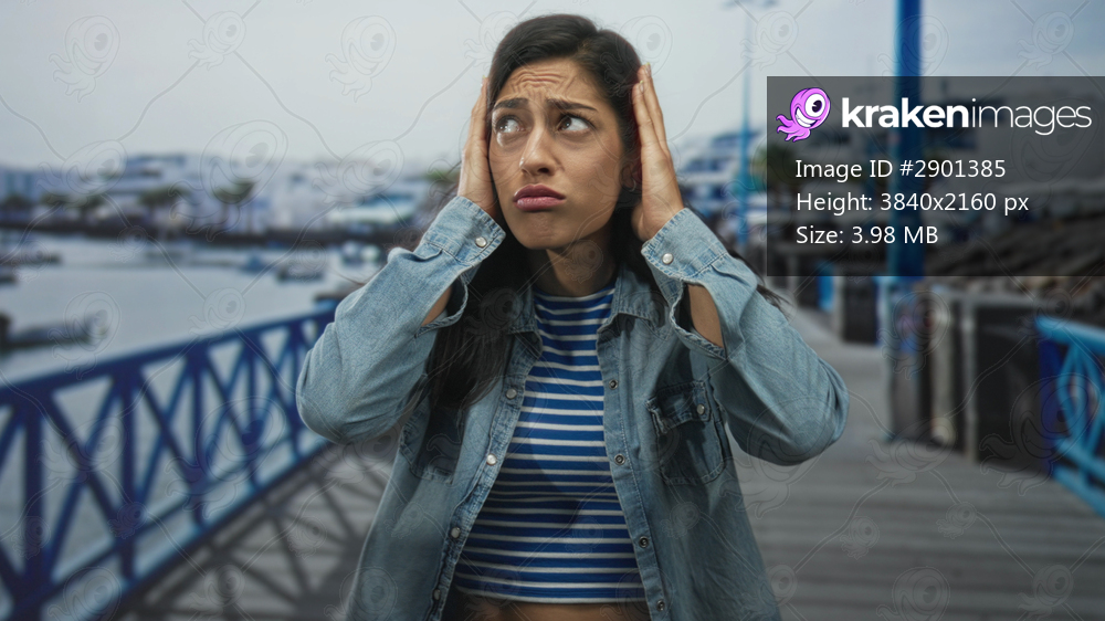 Woman covers ears with hands on a wooden seaside promenade street wearing striped shirt and denim jacket while looking up; frustration.