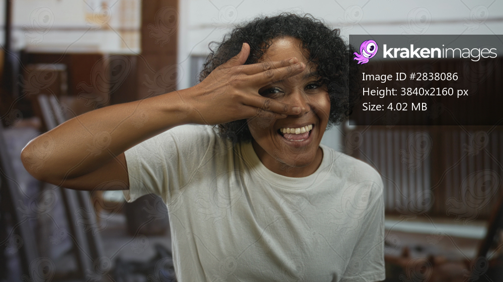 Woman covers eye with hand in half finished building under renovation while smiling broadly; playful curiosity.