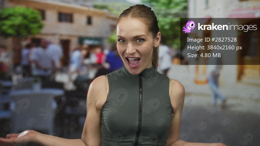 Woman covers eyes with both hands on a busy city street, then lifts arms and smiles widely; joy energy.