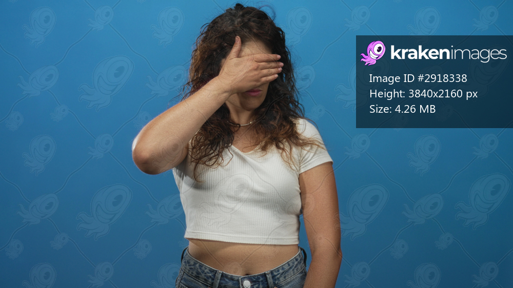 Woman covers eyes with hand in blue studio wearing white crop top and jeans; shyness privacy introspection.