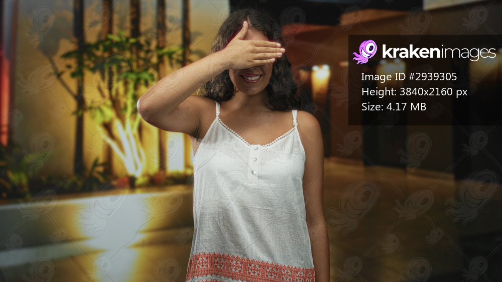 Woman covers eyes with hand in building lobby while smiling in a white embroidered dress, casual pose and warm lighting; playful shyness.