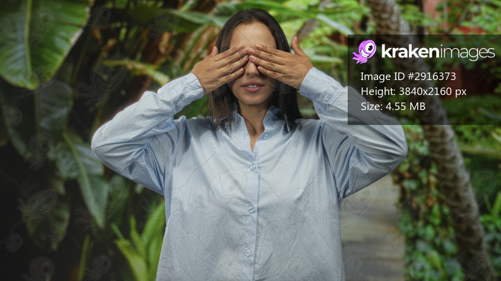Woman covers eyes with hands in a forest among green foliage wearing a blue shirt; surprise curiosity.