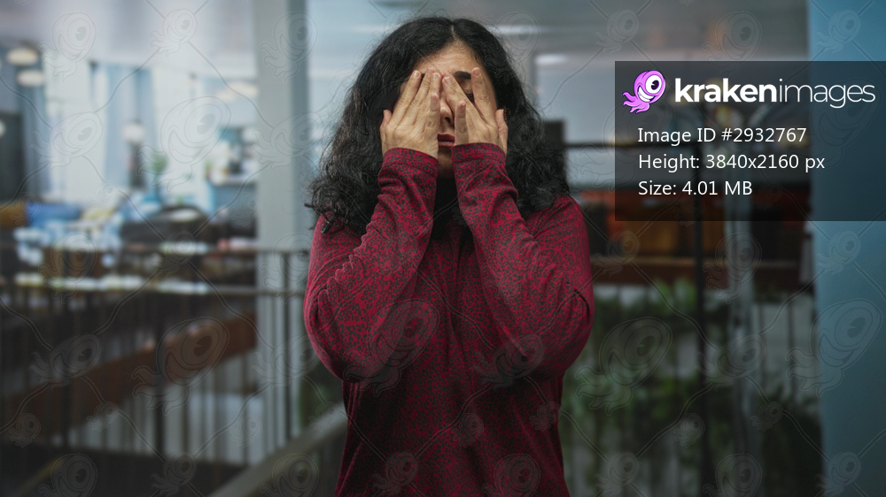 Woman covers eyes with hands in a hotel building lobby, face cupped and tense; sadness vulnerability.