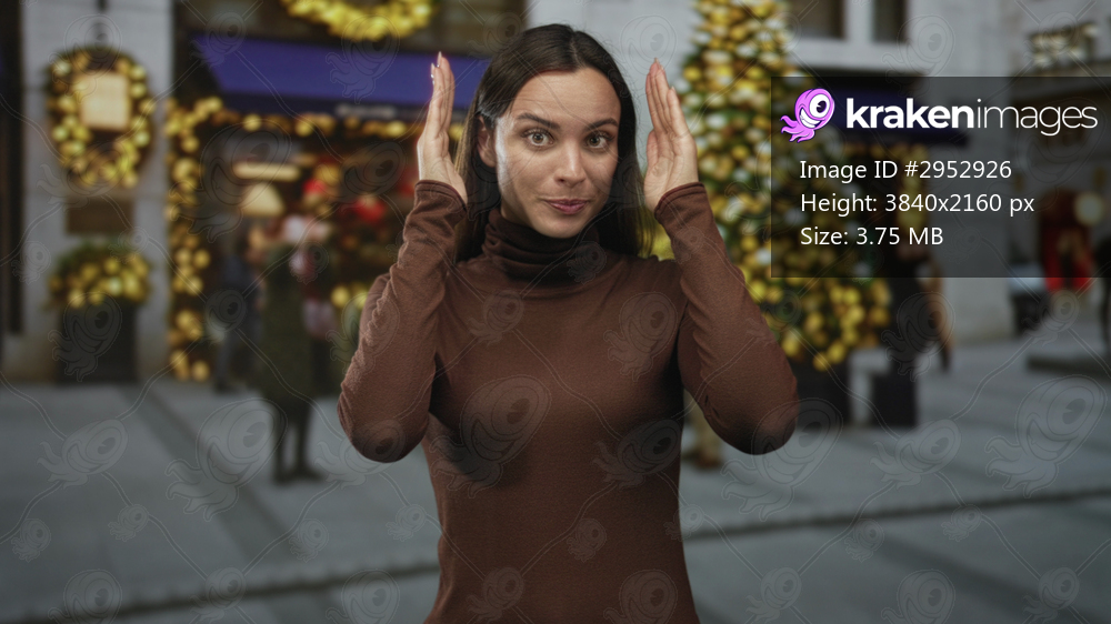 Woman covers eyes with hands on city street near decorated christmas tree and glowing storefront lights while winking and sticking out tongue; playful holiday cheer. - Kraken Images