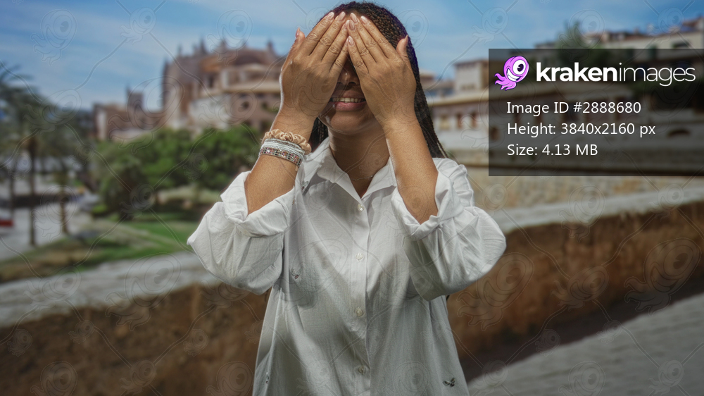 Woman covers eyes with hands and peeks through fingers on an old town street by a stone building, smiling with glasses and bracelets; joyful.