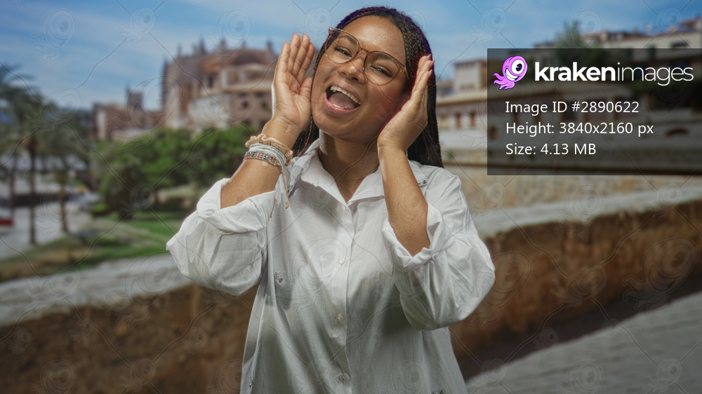 Woman covers eyes with hands and peeks through fingers on an old town street by a stone building, smiling with glasses and bracelets; joyful.