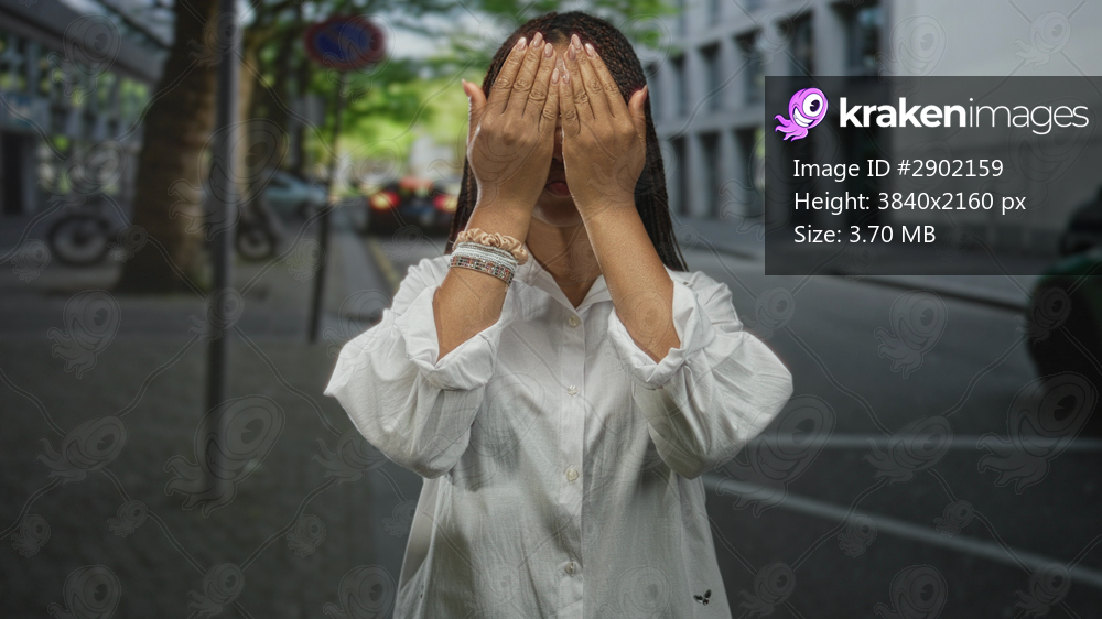 Woman covers eyes with hands and presses lips on a city street wearing glasses and bracelets; frustration reflection.