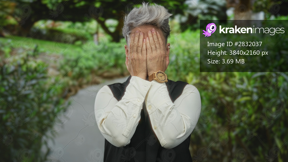 Woman covers face with both hands while standing on a leafy green park walkway; playfulness spontaneity.