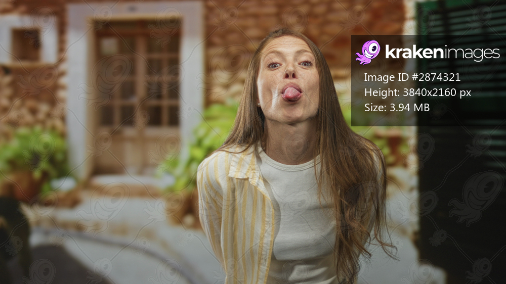 Woman covers face with hand and sticks tongue out at building entrance, smiling in casual shirt; playful moment.
