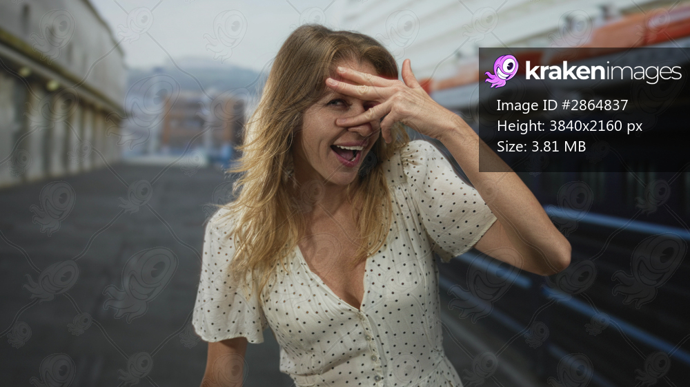 Woman covers face with hand while laughing on street beside a docked cruise ship and metal railing, wind tousles her hair; playful moment.