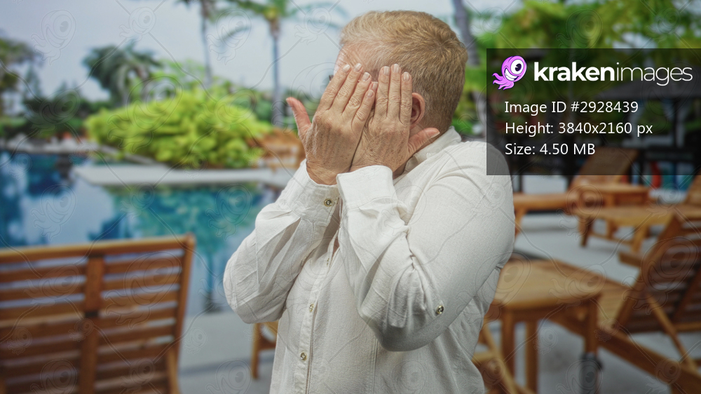 Woman covers face with hands at hotel building poolside among wooden lounge chairs and palm trees; surprise shyness vacation.