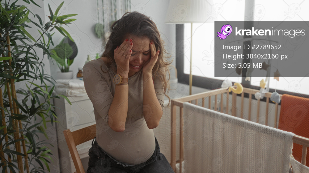 Woman covers face with hands and holds pregnant belly crying beside crib in building; maternal anxiety.