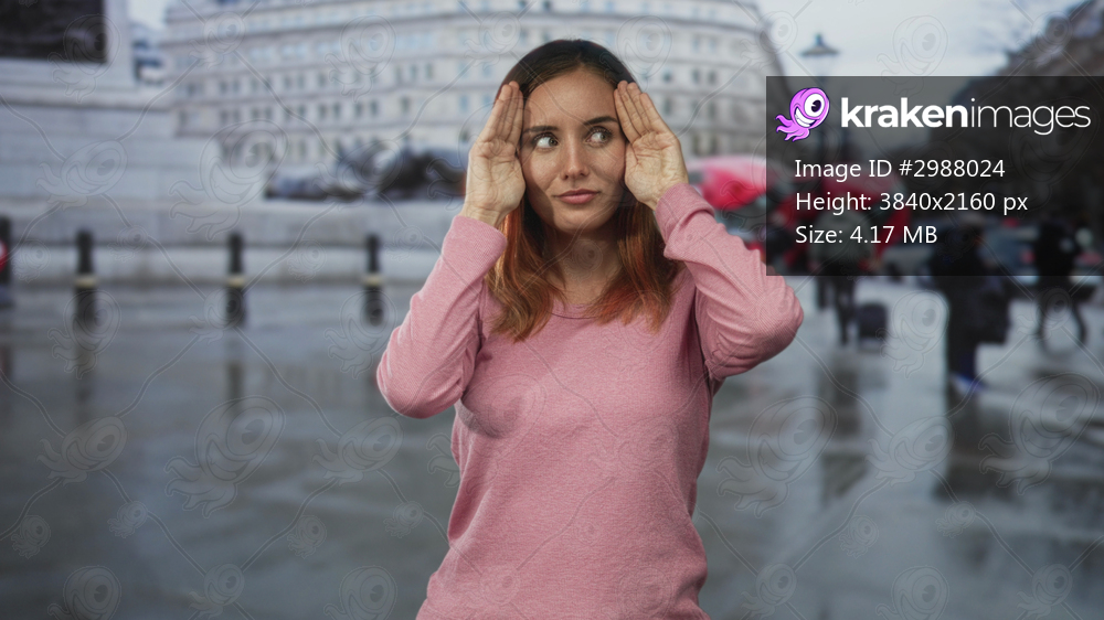 Woman covers face with hands in a gesture on a wet street with red double decker buses and a monument visible; anxiety solitude introspection.