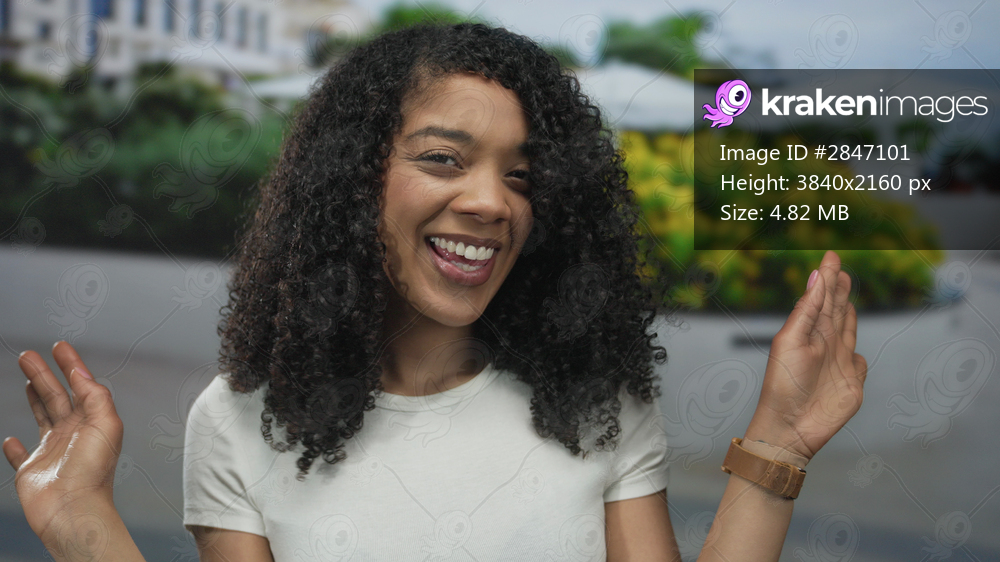 Woman covers face with hands on city street before raising both hands in playful reveal; joy surprise.