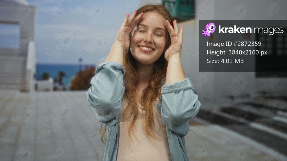 Woman covers face with hands and peeks through fingers in front of white building on street; playful curiosity.