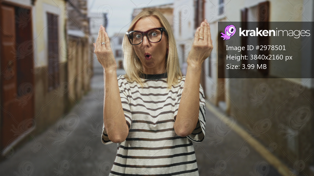Woman covers face with hands and rings, wearing striped shirt, standing in a narrow street; playful curiosity.