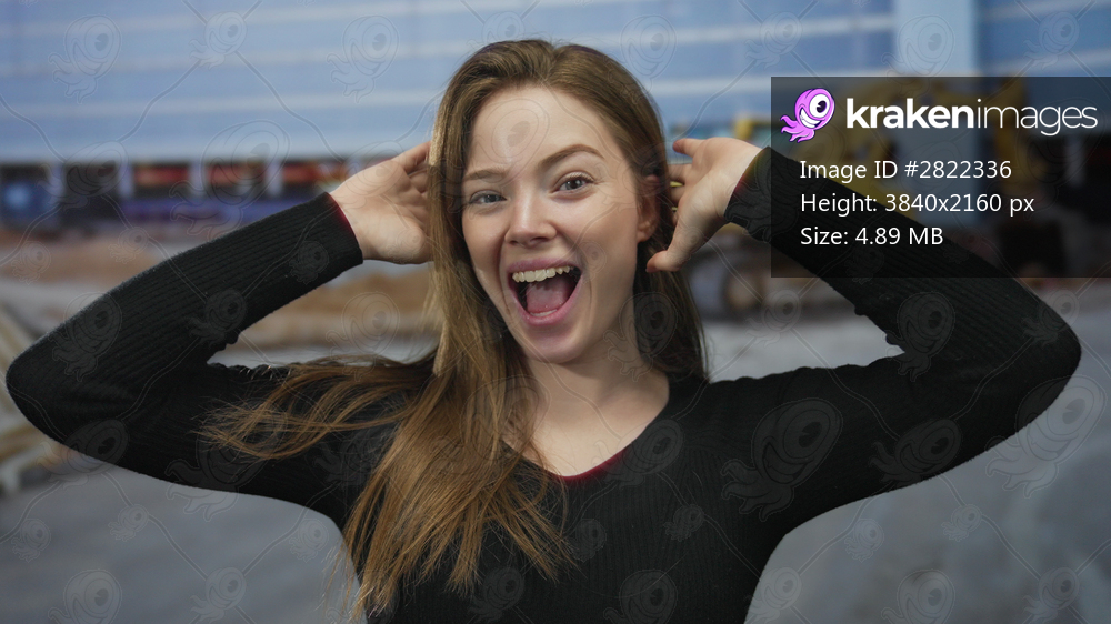 Woman covers face with hands and wide open mouth smile beside yellow excavator in building; playful fun.