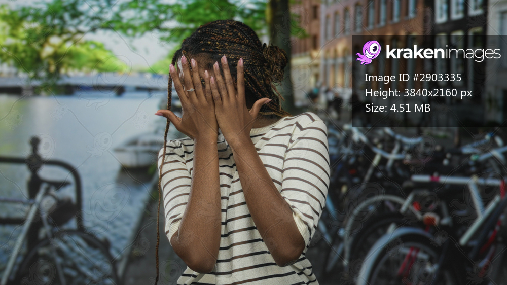 Woman covers face with hands and winces on a canal side street in amsterdam with bicycles in view; anxiety vulnerability.