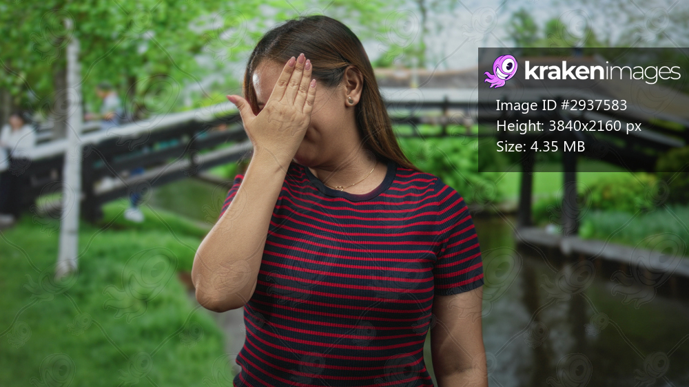 Woman covers face with right hand on a street bridge over a canal in amsterdam while standing near water; embarrassment privacy.