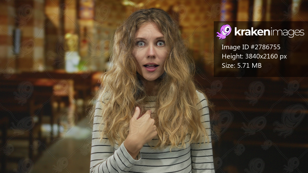 Woman covers hand over her mouth as she looks surprised inside a church with a blonde young happy interior face during celebration.