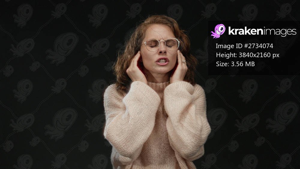 Woman covers her ears to block noise on isolated black background wearing glasses and sweater expressing discomfort through body language