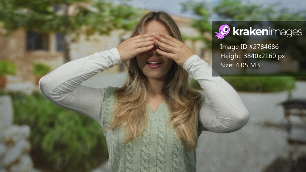 Woman covers her eyes with both hands in a lush green park setting under natural sunlight; surprise curiosity.