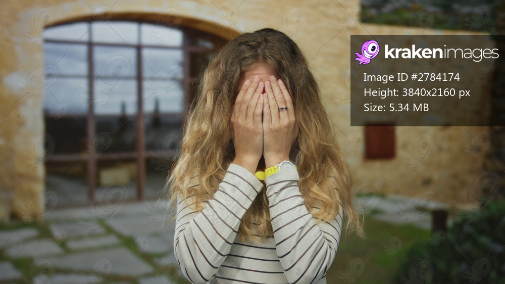Woman covers her hands before peeking from a cottage window to reveal a blonde young playful smile and glowing face framed by a rustic arch.