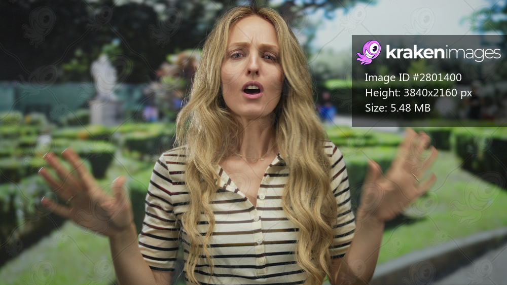 Woman covers her hands while looking frustrated in a park scene, young blonde locks visible outdoors among green hedges, expressing a facepalm gesture. - Kraken Images