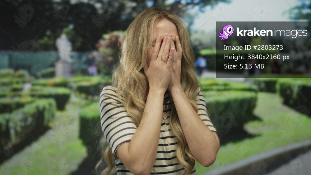 Woman covers her hands while looking frustrated in a park scene, young blonde locks visible outdoors among green hedges, expressing a facepalm gesture. - Kraken Images