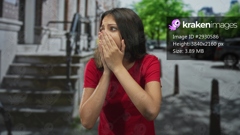 Woman covers mouth with both hands on city street, palms raised and shoulders shrugged in expressive plea; anxiety.