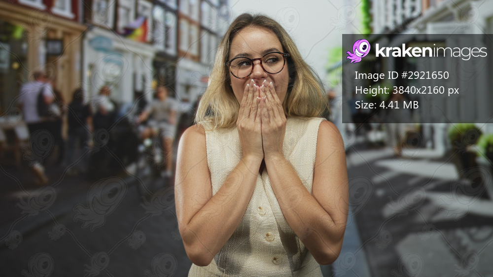 Woman covers mouth with both hands on city street wearing glasses and sleeveless vest, surrounded by blurred pedestrians and storefronts; surprise reaction. - Kraken Images