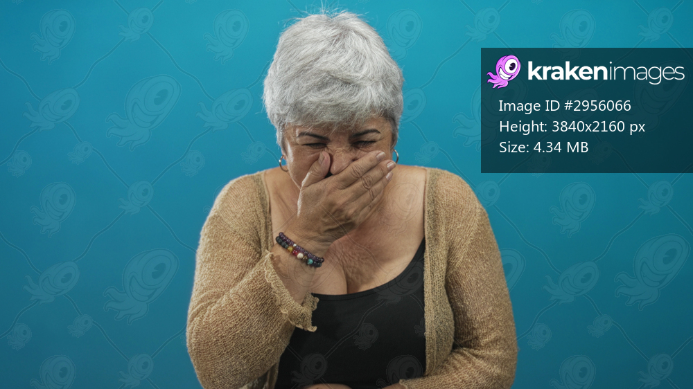 Woman covers mouth with hand and cradles her stomach against a teal studio wall, grey hair visible, cardigan and bracelet details clear; amusement.